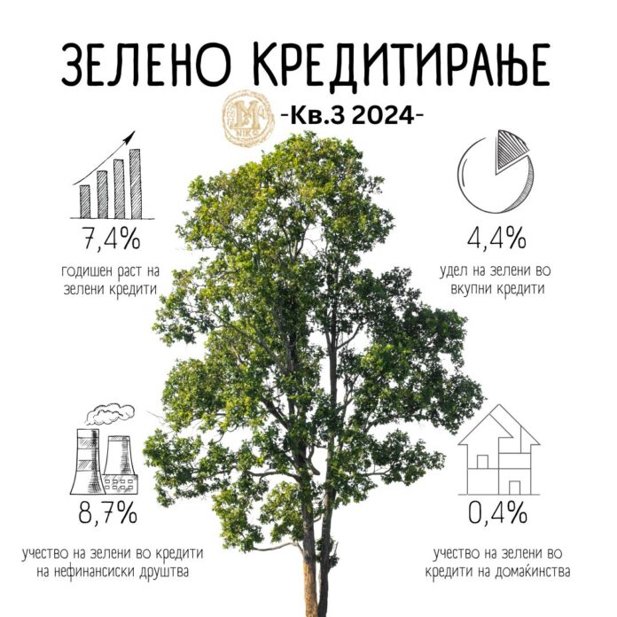 Зелените кредити бележат годишен раст во портфолијата на банките и во третиот квартал од 2024 година. Според податоците на Народната банка, на крајот на септември 2024 година, растот на зелените кредити во однос на истиот период лани изнесува 1,4 милијарди денари, или 7,4%. Во споредба со крајот на 2019 година, кога започна прибирањето и објавувањето на овие податоци, зелените кредити се зголемени за 2,8 пати. Зелените кредити се заеми наменети за проекти коишто поддржуваат одржливи, еколошки цели, или цели коишто придонесуваат за зелената транзиција во општеството, како што се инвестициите во нова еколошка технологија.