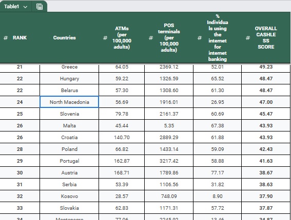 Меѓу другото, во анализата се користени податоци за бројот на банкомати и бројот на терминали за плаќање со картички на 100.000 луѓе, лимитот што може да се потроши при плаќање со картичка и бројот на оние кои користат интернет банкарство.