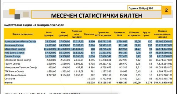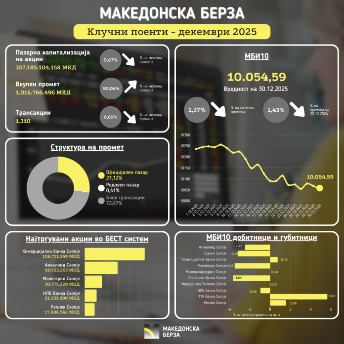 Македонската берза во декември беше во знакот на ‘големата петорка’. Најновиот статистички билтен открива кои се најтргуваните акции на официјалниот пазар.