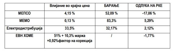 “Донесените цените по блокови за период на високи дневна тарифа се следни: прв блок намалување од 7,04 %, втор блок намалување од 4,09%, трет блок зголемување од 2,54% и четврт блок зголемување од 2,42%. РКЕ носи одлуки за цени и тарифи без ДДВ. Домаќинствата со просечна потрошувачка ќе плаќаат пониска цена за енергија и мрежарина за 4,26 %, а од декември со стартот на дневната евтина тарифа ќе следи линеарно намалување за 5 % на сметките“ изјави Марко Бислимоски